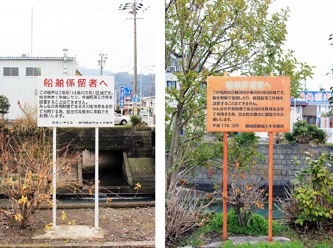同じ立札も、用宗漁港の正面に建つ(右)と、